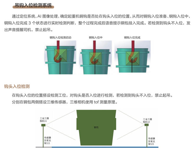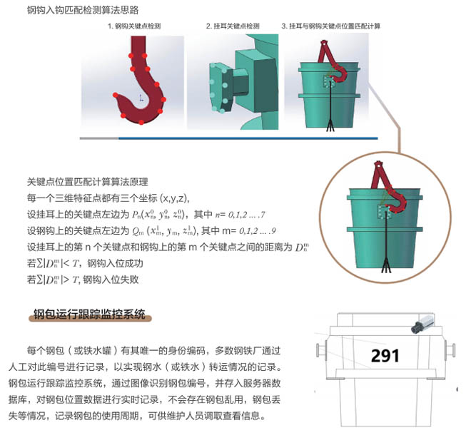 近年來(lái),冶金行業(yè)智能化、自動(dòng)化、云時(shí)代等大數(shù)據(jù)廣泛應(yīng)用,煉鋼車間是冶金行業(yè)的重點(diǎn)區(qū)域,廠區(qū)設(shè)備復(fù)雜、環(huán)境差、安全隱患多等因素更需要進(jìn)行設(shè)備自動(dòng)化、智能化的升級(jí)管理、實(shí)現(xiàn)廠區(qū)無(wú)人化智慧工廠目標(biāo)的發(fā)展。起重機(jī)作為煉鋼、煉鐵、軋鋼車間的主要設(shè)備,起重機(jī)工作中對(duì)在工位操作越來(lái)越精準(zhǔn),需要駕駛員及時(shí)準(zhǔn)確觀察工位狀態(tài),由于駕駛室的位置和現(xiàn)場(chǎng)的工況環(huán)境影響經(jīng)常引起操作失誤,鋼包起吊安全事故頻發(fā),特別是對(duì)于鋼包掛鉤是否完整嵌入掛耳,是否進(jìn)入正確的起吊姿態(tài)沒(méi)有直接的判斷和監(jiān)控。研發(fā)起重機(jī)鋼包定位掛鉤識(shí)別管理系統(tǒng)是安全生產(chǎn)的剛性需求。